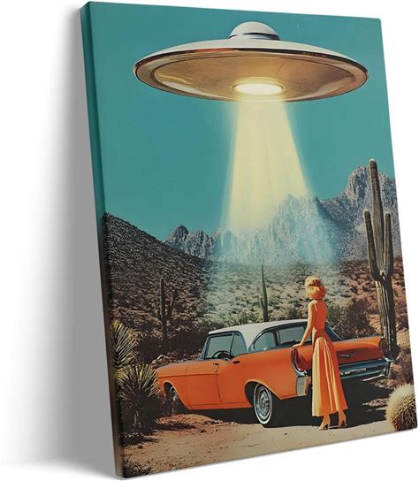 TYPTEK Retro UFO Canvas Wall Art, Alien Spaceship Abduction Pictures Print Framed Art, 1950S Sci-Fi Aesthetic Artwork, Victorian Landscape Oil