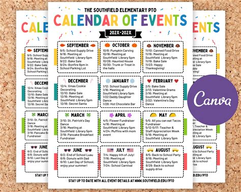 PTA Calendar Of Events Flyer Editable Template For PTO Monthly Event Dates Customizable (Instant Download - Editable In Canva)