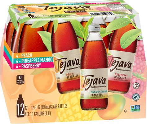 Tejava Black Tea Sampler, 12 Ounce (12-Pack) Glass, Unsweetened, Peach, Raspberry And Pineapple-Mango, Ready-To-Drink Premium Iced Tea