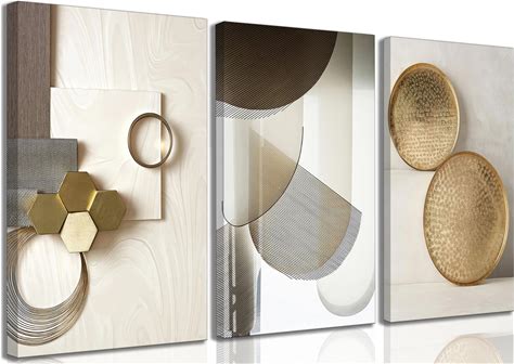 3 Pcs Abstract Gold Geometric Boho Canvas Wall Art Mid Century Modern Minimalist Aesthetic Luxury Metal Artwork Pictures Wall Decor Posters Prints For