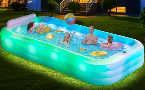 Large Inflatable Pool With Lights - 145'' X 74'' X 22'', Thickened 0.6mm Blow Up Pool With Seat Backrest, 7 Color Changes Oversized Swimming Pool For Family Backyard Party Summer(Pump Included)